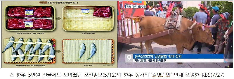 KBS <김영란법 ‘위헌 여부’ 내일 결론…쟁점은?>(7/27)은 리포트를 시작하자마자 “소를 끌고 도심에서 시위”에 나선 한우 농가 농민들의 모습을 보여줬다. “부정청탁 금지법, 이른바 김영란법 시행 철회를 요구”했다는 것이다. 여기에 김영란법이 “일부 민간 부문에서도 3만 원 이상 식사, 5만 원 이상 선물 등을 받는 것”에 대해 “광범위하게 금지”하고 있다는 설명도 덧붙였다. 이후엔 김영란법에 대한 비판이 이어졌다. “배우자가 금품을 받았을 경우 이를 신고하도록 강제한 조항”은 “연좌제 금지와 양심의 자유를 침해하는 과도한 규제”라서 논란이고, “법에서 금지하는 부정 청탁의 개념이 모호해서 죄형법정주의에 반한다”는 지적도 있다는 것이다. 이렇게 김영란법에 갖은 성토를 내놓고서 보도 말미에 “김영란법에 대한 헌법재판소의 판단에 따라 경제와 사회, 문화 전반에 큰 변화가 예상”된다며 다음날 있을 헌재의 판단을 전했다.