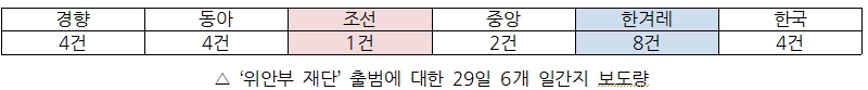 지난해 12월 28일 일본군 위안부 피해자 관련 한일 정부 간 합의에 따른 ‘화해·치유재단’이 28일 출범했다. 피해자들의 의사와 무관하게 정부 주도로 출범한 해당 재단에 대해 야당과 시민단체 등이 강한 반발을 표하고 나선 가운데, 6개 일간지는 29일 모두 관련 보도를 내놨다. 가장 많은 보도를 내놓은 것은 한겨레(8건)였으며, 조선일보는 1건의, 가장 적은 보도를 내놨다. 보도 양상 역시 매체에 따라 완전히 갈렸다.