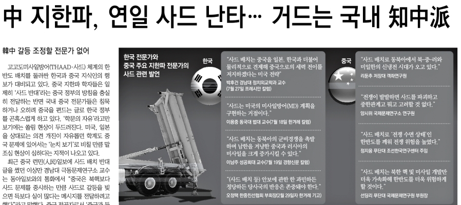 ‧동아일보 <中 지한파, 연일 사드 난타… 거드는 국내 知中派>(8/3, 6면, 구자룡 특파원, 조승호 기자, 조윤경 인턴기자)
