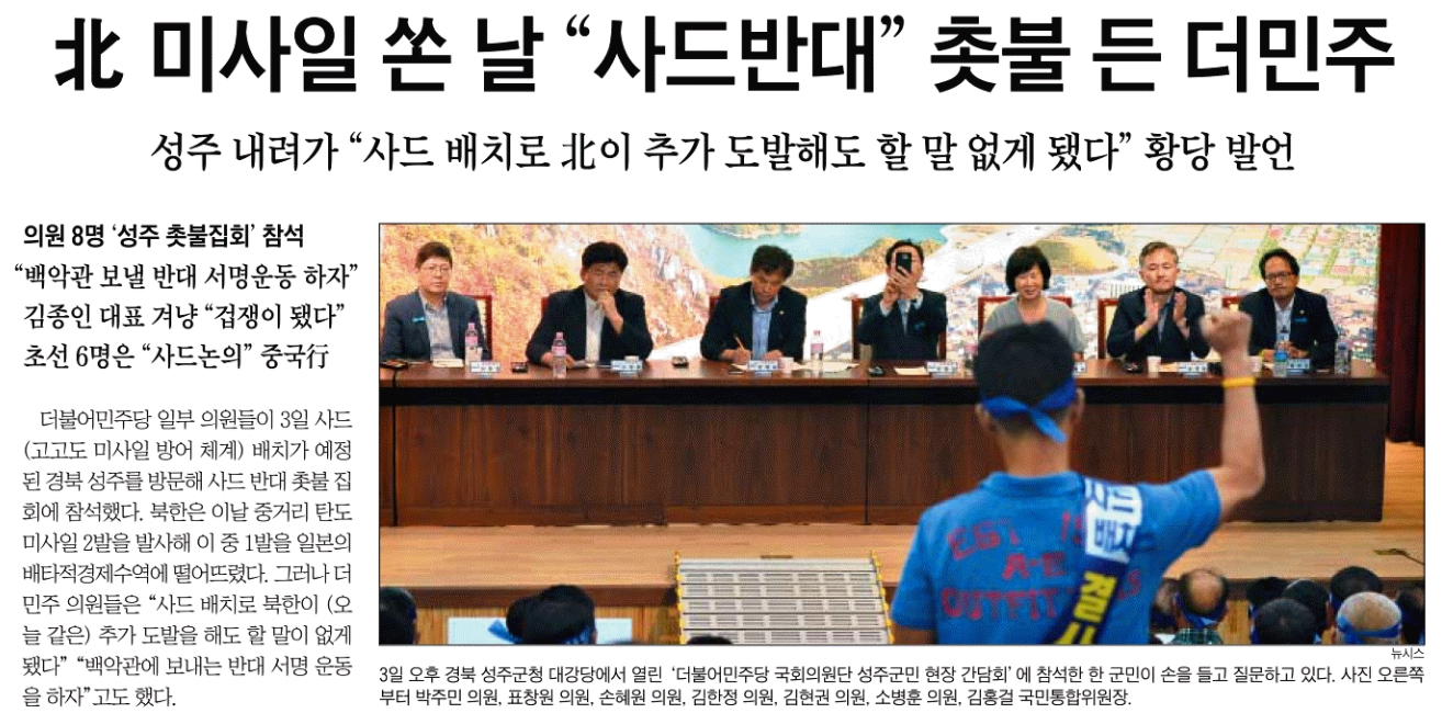 조선일보 <北 미사일 쏜 날 사드반대 촛불 든 더민주>(8/4, 6면, 원선우 기자)