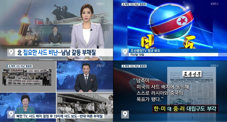 KBS <북 집요한 사드 비난…남남 갈등 부채질>에서 김민정 앵커는 “북한이 대내외 매체를 총동원해 집요하게 사드 배치를 비난하고 있습니다. 한 달 가까이 계속되고 있는데, 내부 체제결속과 남남갈등 등을 동시에 노리고 있는 것으로 분석됩니다”라며 보도를 시작했다. 리포트는 “황교안 총리의 성주군청 방문 소식을 전하며 사드 배치 결정을 비난”한 “북한 관영 조선중앙TV의 정규 보도 프로그램” 화면을 보여줬다. 조선중앙TV가 “총리 경호원들이 주민들에게 폭력을 행사했다며 거짓말로 증오를 부추”겼다고 목소리를 높이기도 했다.