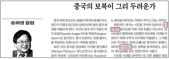 △ 시진핑 국가 주석을 ‘시진핑’이라고 호명한 조선일보 칼럼(7/16)
