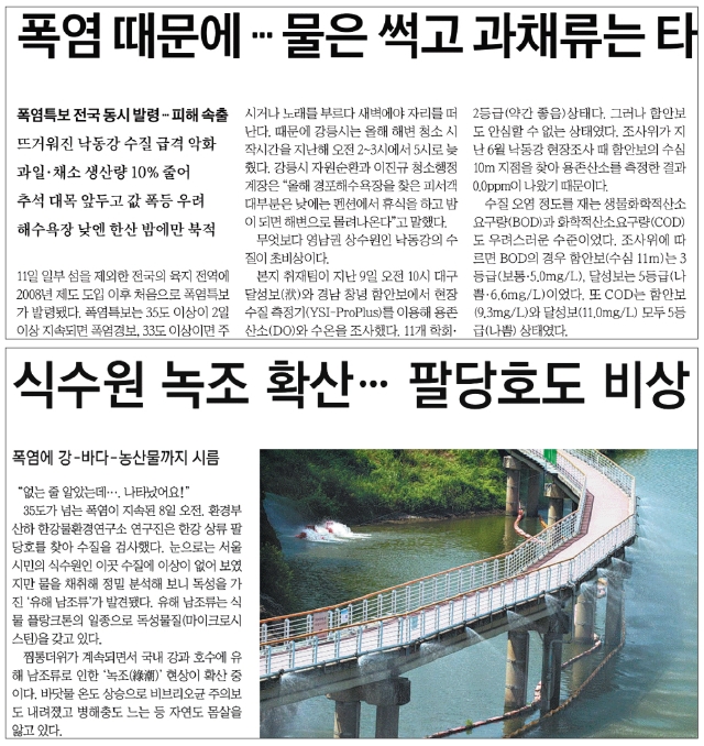 △ 위 중앙일보 <폭염 때문에… 물은 썩고 과채류는 타고 ‘올빼미족’ 피서도>, 아래 동아일보 <식수원 녹조 확산… 팔당호도 비상>