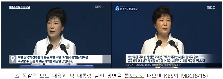 KBS 톱보도 <북 주민‧간부 향해…“통일은 행복의 기회”>와 MBC 톱보도 <“통일은 북 주민에 새로운 기회 될 것”>은 모두 박근혜 대통령의 경축사 중 ‘대북 메시지’를 조명한 보도였다. 심지어 앵커멘트와 기자의 리포트와 녹취인용한 대통령 발언도 거의 똑같았다.