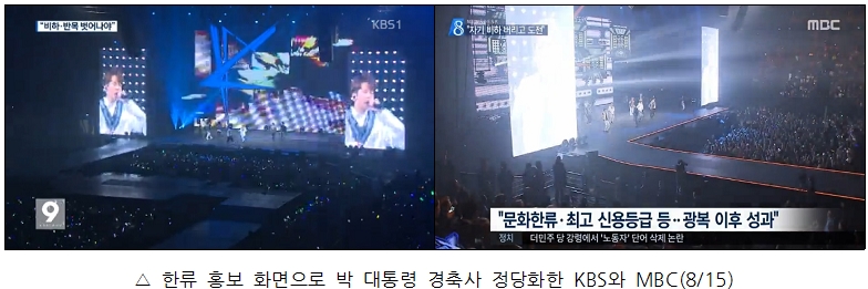 이 같은 대통령의 광복절 축사는 많은 논란이 되었지만, 방송사 저녁종합뉴스는 조용했다. 15일, 대통령 축사에 문제제기를 한 것은 JTBC뿐이다. 지상파 3사는 약속이나 한 듯 똑같은 내용의 찬양 보도 2건을 톱보도부터 배치했다. 특히 KBS와 MBC는 화면 구성까지 공유하면서 박근혜 대통령의 발언을 선전하기에 바빴다.
