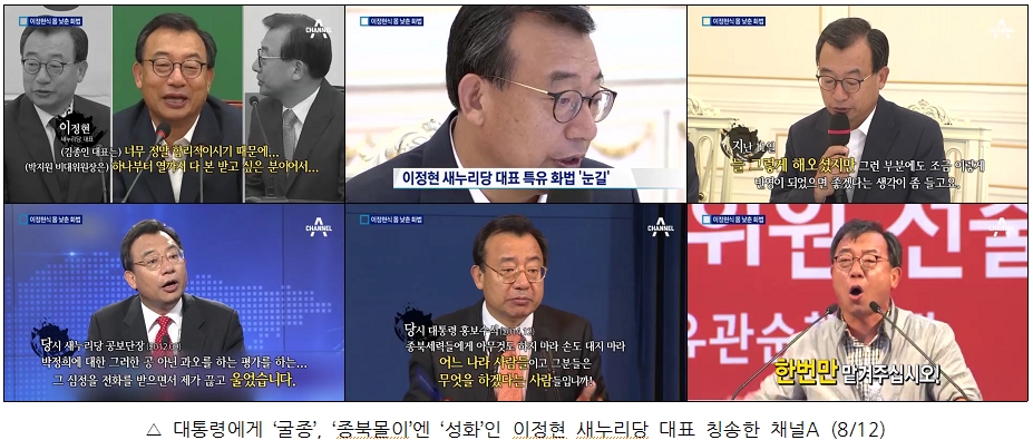이정현 대표의 ‘화법’을 시종일관 칭송한 채널A <겸손과 걱정 사이 ‘이정현식 화법’>(8/12)은 도를 넘었다. 박근혜 대통령에게는 지나치게 자세를 낮추고 야당에 대한 공격이나 ‘종북몰이’에 열을 올리는 이정현 대표의 ‘화법’은 찬사의 대상이 아니라 비판의 대상이 되어야 한다. 박근혜 대통령을 호위하기 위해 세월호 참사 당시 KBS 보도국장을 윽박질렀던 ‘보도 개입’의 충격도 아직 채 가시지 않은 상황이다. 세월호 참사는 물론, 우병우 민정수석 등 측근들의 비리와 횡포, 사드 배치에서 드러난 일방주의적 국정 운영 등 박근혜 정부에 대한 국민의 신뢰가 땅을 친 지금, 그러한 청와대에 굴종하고 있는 여당 대표를 극구 감싸려는 채널A의 태도는 무리수라고 할 수밖에 없다.