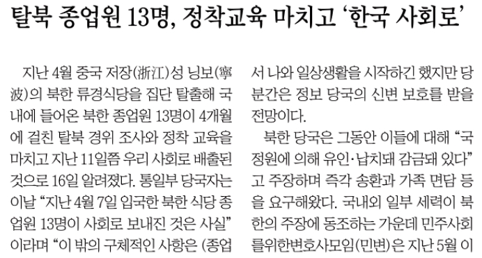 △ <탈북 종업원 13명, 정착교육 마치고 한국 사회로>(8/17)