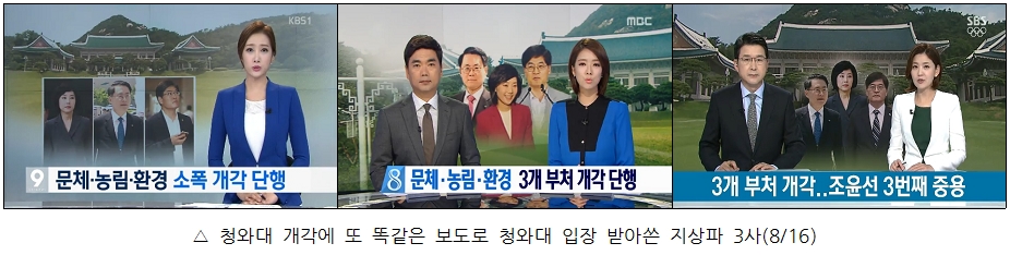 지상파 3사는 이번 청와대 개각을 1건의 보도로 조명했는데 그 내용이 판박이다. KBS, MBC, SBS 모두 리포트 전 앵커 멘트에서 ‘안정적 국정운영을 위한 개편’이라는 청와대의 자화자찬을 객관적 분석인양 내세웠다.