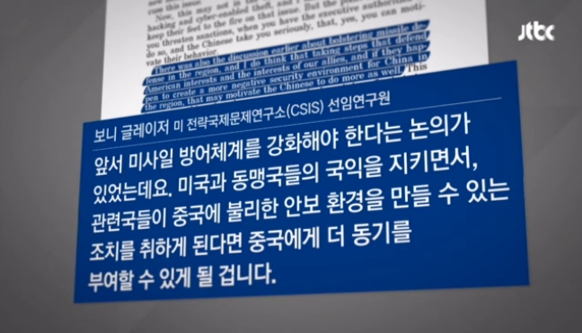 이어서 <‘사드 배치’ 속도 내는 미국>(8/16)에서 제임스 시링 미사일방어청장에 이어 마크 밀리 미 육군참모총장이 방한하는 등 미국이 사드 한반도 배치를 강하게 압박하고 있음을 전했다. <미국의 계산과 한국의 손익>(8/16)에서는 “(미국의) 사드배치 반대론자뿐 아니라 사드 배치를 찬성하는 전문가들”도 “MD에 사실상 편입되는 구조”임을 인정한 상황에서, “유일하게 북한을 움직일 수 있는 나라가 중국인데, 중국이 북핵 문제에 적극적으로 나서게 하려면 동기부여가 필요한데, 그것에 대한 해답 중 하나가 바로 사드라는 지적”이 나왔다고 강조했다. 결국 미국의 의도가 “사드를 갖다놓음으로써 중국을 흔든다. 북핵 해법의 지렛대를 가지고 있는 중국이므로, 그걸 이용할 수 있다는 전략적 사고”에 있음을 JTBC 보도가 입증한 셈이다. 15일부터 보도를 주도한 정제윤 기자는 “이게 사실은 중국의 눈치를 보냐 안 보냐 이런 문제는 아닙니다”라고 강변한 뒤 “이제는 미국이 아닌 우리의 타임 테이블을 가져야 한다”고 주장했다. 사드 배치를 사실상 되돌리기는 어려운 상황에서 “사드 배치를 서두르기보다는 사드로 경색된 어떤 외교채널에 있어서의 복원에 신경을 좀 더 써야 된다”는 것이다.