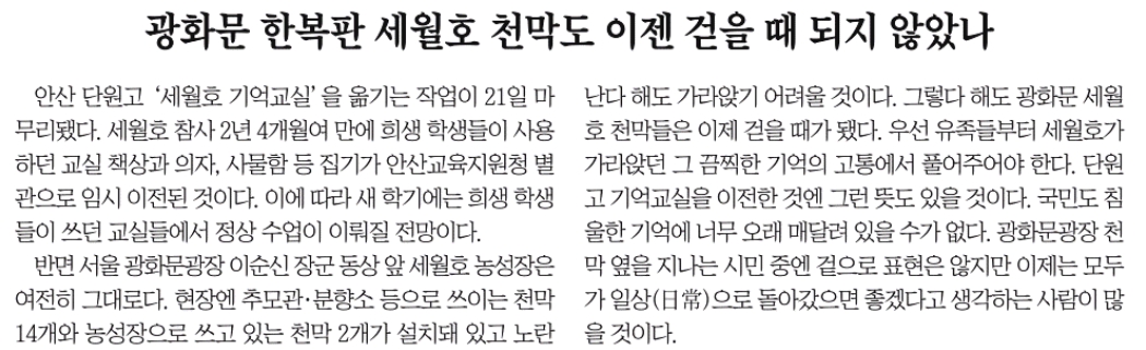 조선일보는 사설 도입부에 기억교실 이전 작업 완료로 “새 학기에는 희생 학생들이 쓰던 교실들에서 정상 수업이 이뤄질 전망”이라며 “반면 서울 광화문광장 이순신 장군 동상 앞 세월호 농성장은 여전히 그대로”라 운을 띄웠다. 이어 “천막 14개와 농성장으로 쓰고 있는 천막 2개가 설치돼 있고 노란 리본 조형물, ‘세월호 특조위 활동 보장하라’고 적힌 입간판이 어지럽게 놓여 있”다며 흉물스러움을 강조했다. 또한 “농성장엔 유경근 세월호참사가족협의회 집행위원장이 세월호특별법 개정을 요구하며 단식 농성”을 하고 있는데 “외국인 관광객을 비롯해 많은 시민이 이런 장면을 흘깃흘깃 보며 지나가고 있다”고 언짢음을 표현했다. 거리의 미관, 외국인 관광객과 시민들의 시선을 의식하며 세월호 천막을 철거해야 한다는 주장은 꾸준히 반복되어 왔다.