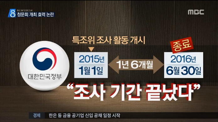 MBC <조사 기간 논란인데…“3차 청문회 하겠다”>는 자사 간부 출석 문제를 언급한 후 곧바로 특조위 조사 기간이 끝났다고 강조했다. 이것도 정부 입장을 대변하며 세월호 참사의 진실을 묻으려는 수작에 불과하다.