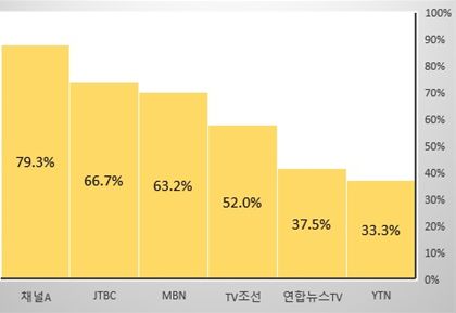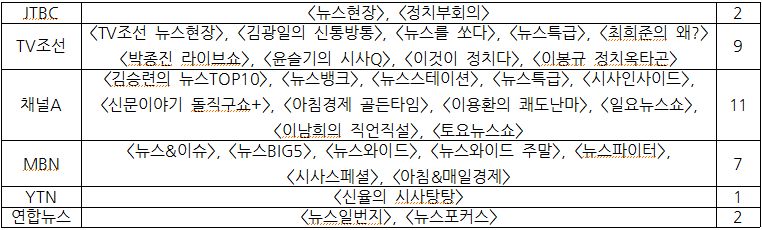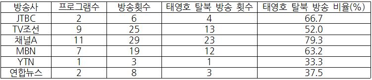 전체 조사 대상 프로그램 중 84% 가량을 차지하는 채널A, MBN, TV조선은 모두 태영호 탈북 아이템 방송 비율이 절반을 넘겼다. 특히 채널A는 79.3%에서 태영호 탈북 방송을 다뤄서, 방송 5회 중 4회는 태영호 아이템을 다룬 셈이다. JTBC는 시사토크 프로그램 수가 적었으나, 6회 방송 중 4회에서 다루었기 비율이 높게 나왔다. MBN도 63.2%, TV조선도 52%의 방송에서 태영호 탈북을 다뤘다.