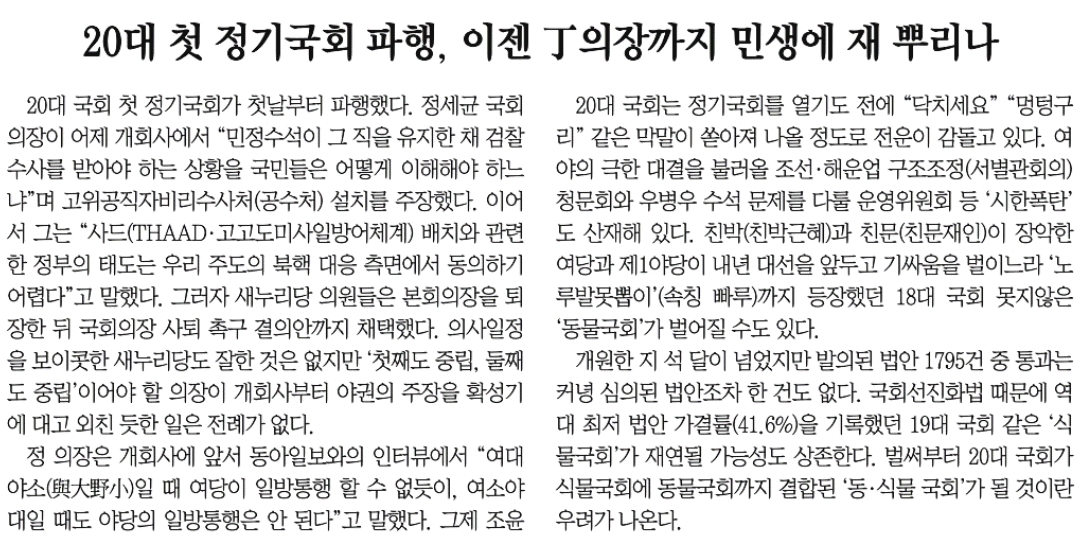 실제 <사설/20대 첫 정기국회 파행, 이젠 丁의장까지 민생에 재 뿌리나> (9/2)에서 동아일보는 “의사일정을 보이콧한 새누리당도 잘한 것은 없지만 ‘첫째도 중립, 둘째도 중립’이어야 할 의장이 개회사부터 야권의 주장을 확성기에 대고 외친 듯한 일은 전례가 없다”고 지적했다. “이런 우려를 불식시킬 가장 큰 책임이 국회의장에게 있다” “정 의장은 국회 파행에 대해 사과하고, 새누리당도 한발 물러나 하루빨리 정기국회를 정상화해야 한다” “정 의장이 시간을 끌다간 아직도 ‘대권 욕심을 못 버렸다’는 소리도 나올 수 있다”는 지적을 쏟아냈다.