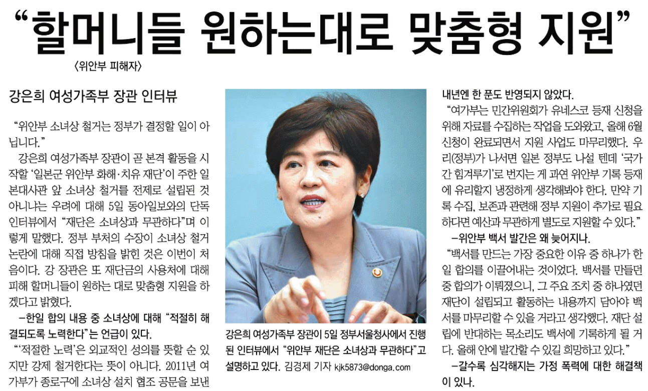‘할머니들이 원하는 대로 지원에 나서겠다’는 메시지를 담은 7일자 강은희 여성가족부 장관 인터뷰 기사는 이 같은 동아일보의 후안무치함을 재확인시켜준다. 해당 보도에서 강 장관은 “위안부 ‘화해·치유재단’ 설립이 소녀상 철거로 이어질 일은 없다”며 “재단은 소녀상과 무관하다”는 입장을 밝혔다.