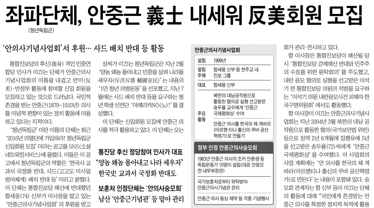 조선일보 <좌파단체, 안중근 義士 내세워 反美회원 모집> (9/11, 10면, 문현웅 기자, https://goo.gl/FLkSE4)