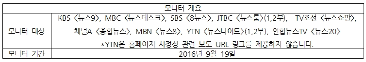 반면 같은 내용을 다룬 JTBC는 <북 '최악 물난리'에 떠오른 인도적 지원>(9/18, 톱 보도, 이화종 기자, https://goo.gl/86Brzy)에서 여야 의견을 균형 있게 보도했을 뿐 아니라 “(북한인권)법은 북한 주민의 인권 증진을 위해 인도적 지원을 명문화했습니다”라며 북한인권법에 대한 사항도 빠짐없이 보도했다.