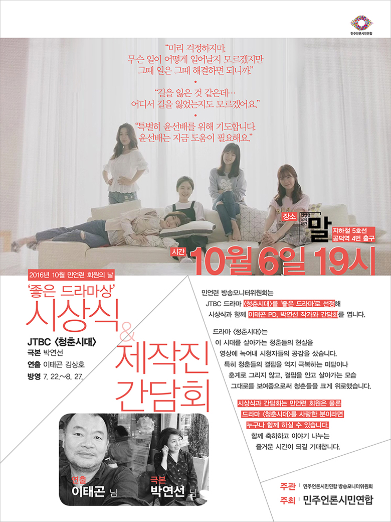 10월 6일(목) 저녁 7시 민언련 교육공간 <말>에서 열리는 <민언련 좋은 드라마상 수상식>은 이태곤 PD와 박연선 작가와 간담회도 열립니다. 민언련 방송모니터위원회에 관심 있는 분은 물론, 드라마 <청춘시대>를 사랑한 분이라면 누구나 함께 하시면 좋겠습니다.
