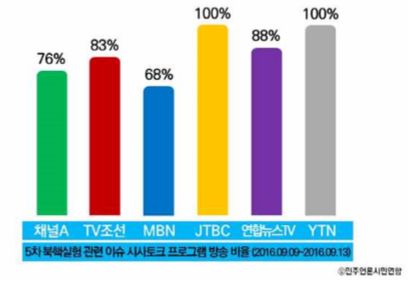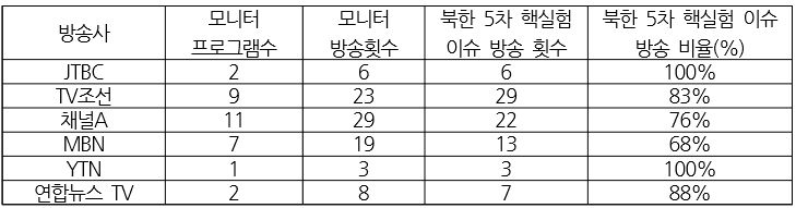민주언론시민연합(이하 민언련)은 ‘북한 5차 핵실험’ 이슈를 다룬 6개사 32개 프로그램의 시사토크 프로그램을 분석했다. 핵실험일인 9일부터 추석 전날인 13일까지 닷새간 시사토크 프로그램은 북한소식으로 풍성했다. 불안과 공포는 시사토크 프로그램의 패널들이 대신했다. 북한 5차 핵실험과 관련 이슈들(북핵 대응 방안, 핵실험의 원인, 핵폭발 예측, 북한 정세 등)을 다룬 방송 회차는 다음과 같다.