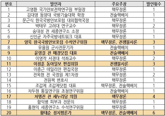 종편 패널들은 대북 대응책으로 군사적 방안을 내놓았다. ‘핵무장론’, 즉 ‘핵은 핵으로 해결할 수 있다’는 주장이 가장 많았다. 나아가 선제공격을 지지하거나 전쟁까지 각오해야한다는 ‘전쟁불사론’도 있었다. 민언련은 북한 5차 핵실험 당일인 9일부터 13일, 닷새 동안 32개 시사토크 프로그램에서 ‘핵무장론(전술핵배치)’이나 ‘전쟁불사론’을 지지한 주요 출연자를 꼽아보았다. 발언 횟수는 핵무장론 혹은 전쟁불사론을 주장한 프로그램 출연 횟수다. 한 프로그램에서 여러 번 발언한 경우는 한 번으로 계산했다. 발언자 별 주요 발언 내용은 첨부파일 말미에 별도로 첨부했다.