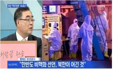 MBN <뉴스와이드>(9/12)에서 황태순 정치평론가 역시 “그 공동(한반도 비핵화 공동선언)이 남북 공동 선언이에요. 북한에서 깨진 겁니다. 이미 우리는 껍데기를 쥐고 있는 거예요. 거기에 너무 얽매일 필요는 없습니다”라며 핵무장론을 지지했다. 북한이 NPT 탈퇴한 것은 부적절한 결정이지만 YS 대북 강경론, 남북관계 악화 등 당시의 여러 상황도 감안해야 한다. 무엇보다 북한이 그랬으니 ‘우리도 그래도 된다’는 논리는 유아적 발상이다. 북한은 폐쇄형 사회주의 체제를 지키고 있는 유일한 국가다. 이 일차원적 논리가 국제사회에서 통하길 바라는 것이다.