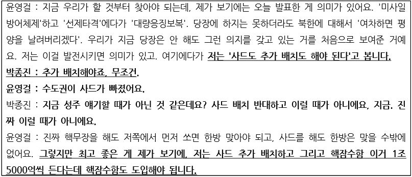 사드 추가 배치가 실제 어떤 효용이 있는지에 대한 언급은 전혀 없었다. 그럼에도 사드를 추가 배치하고, 심지어 핵잠수함까지 들이자는 주장만 난무했다. 핵잠수함 배치는 ‘한반도 비핵화’를 어기는 행동이다. 과거 노무현 정권 시절 핵잠수함 개발에 대한 의혹이 있었다. 당시 국방부는 ‘한반도비핵화’를 이유로 들며 부인했다. 한미 원자력 협정에도 위배되는 행위이기도 하다. 농축 우라늄은 미국 승인 없이 살 수 없다. 구매조차 어렵다. 그럼에도 이런 사실관계는 모두 배제하고, 무기 비축하자는 선동만 하고 있다.