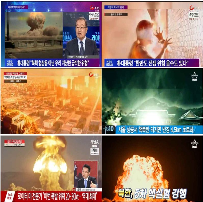채널A <뉴스TOP10>(9/11)은 영상 말미에 김정은 스틸사진까지 넣었다. 남북 전쟁 직전 상황처럼 이해하게끔 했다. 영상 끝나고 이어진 스튜디오의 대화는 불안감을 더욱 고조시켰다. 진행자 신석호 씨는 “히로시마 핵폭발과 유사하다고 하는데, 히로시마처럼 상공 500M에서 핵폭탄이 터지면 피해가 도대체 어느정도인가요?”라고 출연진에게 묻는다. 그러자 이정훈 동아일보 편집위원이 “서울상공에요? 뭐 다 죽었다고 생각하셔야죠 그걸 굳이 설명할 필요가 있겠습니까? 전쟁 끝"이라 답했다.