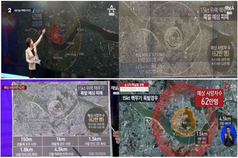 아래 네 화면은 마치 한 방송 같지만 다른 방송이다. 서울 핵폭발 시뮬레이션 결과 총 62만 명이 사망할 것이란 관측이다. 이를 언급하지 않은 프로그램이 드물 정도다. 대부분 자료의 출처를 밝히지 않거나 ‘미국방부’ 예측이라 짧게 언급되었다. 언제 나온 어떤 제목의 보고서인지는 구체적 표기는 없다. 직접 찾아보지 않고서는 확인할 길이 없다. 참고자료는 미 국방부 기술검토국(DTRA)이 발표한 핵폭격 시뮬레이션 결과, 2004년 발표된 천연자원보호협회(NRDC)의 보고서 <한반도에서 의 핵사용 시나리오(Nuclear Use Scenarios on the Korean Peninsula)> 등 일 것이라 추정될 뿐이다. 채널A <이용환의 쾌도난마>(9/9) 역시 미국방부의 시뮬레이션 결과를 언급한다. 역시 별도의 구체적 출처 표기는 없었다. 다행히 신인균 자주국방네트워크 대표의 기억에 의존해 ‘국방위협감소국’이라 언급되었다.