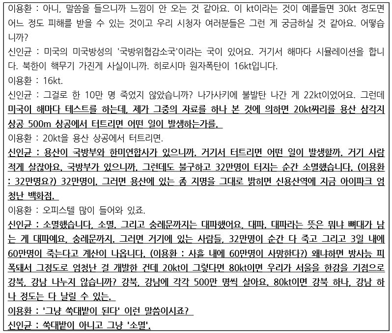 대화 내용은 박대통령의 전쟁이 불가피할 수도 있다는 발언에 대한 이 석좌교수의 견해였다. 이 석좌교수는 진행자 박종진 씨에게 정확한 발언 내용이 무엇인지 되묻고, 전쟁은 상수라는 견해를 밝혔다. 자료 영상이 굳이 필요하지 않았다. 공포 조성을 위해서가 아니라면, 자료의 당위성을 이해하기 힘들다. <박종진 라이브쇼> 뿐 아니라 타 프로그램도 마찬가지다. 유튜브에 떠도는 영상이나 출처가 명확하지 않은 영상을 보여주며 공포를 조성했다. 특히 핵폭발 영상은 다양하게, 발언 내용과 관계없이 시시각각 등장했다.