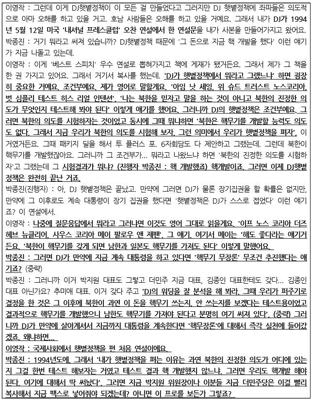 ‘북한이 핵을 가지면, 한국과 일본 역시 가져도 좋다’는 발언 역시 편협한 해석이다. 이것은 햇볕정책이 본래의 의도대로 펼쳐졌을 때를 전제로 한다. 하지만 진행자 박종진은 이를 반복해서 언급하며 ‘DJ 핵무장론’을 주장하기 시작한다. “지금도 햇볕정책 운운하고 하는 사람들은 이걸 안 읽었네요? DJ를 모르는 사람들이네요?”라며 호도하기에 이른다.