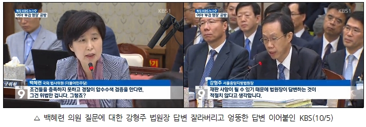 핵심적 내용인 백혜련 더민주 의원이 강형주 서울중앙지법원장을 향해 질문한 내용은 “조건들을 충족하지 못하고 경찰이 압수 수색 검증을 한다면, 그건 위법한겁니다. 그렇죠?”라고 부분만 발췌해서 보여줬다. 이 질문이 무슨 의미인지 설명조차 없이 뚝 잘라 백 의원의 질문만을 보여주더니 더 황당한 것은 강형주 법원장이 “일단 제안에는 따라야 한다고 본다”고 답변한 부분은 싹둑 잘라내 버렸다. 질문만 보여주고 답변 장면은 보여주지 않는 황당한 편집이며, 발언의 의미를 대부분의 시청자가 이해하기 어렵게 하는 뉴스편집인 것이다. 대신 “유족과의 협의가 결렬되는 상황에 대해서 법원은 즉답을 피했”다면서 “재판사항이 될 수 있기 때문에 법원장이 답변하는 것이 적절치 않다고 생각합니다”라고 두루뭉술하게 책임을 피해간 강 법원장의 발언만 덧붙였다. 부검을 시도하는 경찰에 불리한 내용은 배제하고 정체된 상황을 보여주는 발언만 보여주는 ‘악마의 편집’이다. KBS는 이외에도 강 법원장의 ‘부검영장은 일부 기각 의미’ ‘부검영장의 압수수색 절차 제안은 의무규정’ 등 경찰의 부검 집행을 부정적으로 해석한 발언들을 모조리 외면했다.