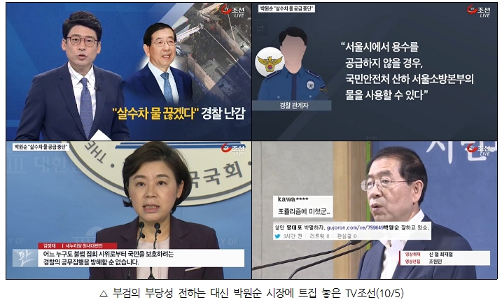 부검영장 강제 집행의 부당성을 인정한 서울중앙지법원장의 발언을 외면한 TV조선은 엉뚱하고 박원순 서울시장을 물고 늘어졌다. TV조선 <“살수차 물 끊겠다” 경찰 난감>(19번째, 조정린 기자, https://bit.ly/2dwQamr)은 이미 보도제목에서 경찰의 입장을 대변하고 있다. 박 시장은 5일 ‘CBS라디오 김현정의 뉴스쇼’에서 “서울시 소방재난본부 소화전에서 쓰는 물은 화재 진압을 위해 쓰는 것”이라면서 경찰이 시위진압에 소화전을 과도하게 사용한다고 지적했다. 앞으로는 시위 진압에 소화전 물을 공급하지 않겠다는 입장도 덧붙였다. 이에 TV조선은 폭력집회 진압 필요성을 강조한 경찰의 입장을 적극적으로 대변했다. 이하원 앵커는 보도 시작부터 “경찰은 과격, 불법 시위진압에 어려움을 겪을 수도 있는데요”라고 말했고 기자도 “물대포를 쏠 때 서울시 산하 소방재난본부에서 물을 공급받는 경찰은 난감해졌습니다”라고 전했다. 여기다 “서울시에서 용수를 공급하지 않을 경우, 국민안전처 산하 서울소방본부의 물을 사용할 수 있다”는 경찰 관계자의 발언, “어느 누구도 불법 집회 시위로부터 국민을 보호하려는 경찰의 공무집행을 방해할 순 없습니다”라는 새누리당의 비판까지 덧붙였다. 보도 말미에는 “인터넷에선 ‘살인 물대포 박멸’을 외치며 박 시장을 응원하는 댓글과 ‘미친 포퓰리즘’이라며 박 시장을 비판하는 댓글이 맞섰”다며 시민 반응을 보여주기도 했다. 막판에 ‘찬반양론’을 보여주며 중립을 가장했으나 시종일관 ‘폭력집회’를 진압해야 하는 경찰의 ‘난감함’과 박 시장 비판에 초점을 맞춘 보도이다.