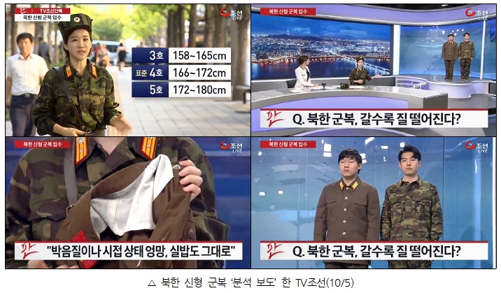 TV조선 <단독/북한 신형 얼룩무늬 군복 입수>에서 김미선 기자는 북한 군복을 직접 입고서 “장병 군복 중간 사이즈인 4호입니다. 제 키가 165cm인데, 이렇게 딱 맞습니다”라고 설명했다. 이어서 “바느질은 엉성하고 마감 처리도 제대로 안 돼 곳곳이 터져”있다고 지적했고 “겨울에도 입으면 못 버틸 것 같은데요. 금방 찢어질 것 같은데요”라는 시민 인터뷰까지 땄다. TV조선이 분석한 것은 군복뿐이 아니다. “군화는 고무신에 천을 본드로 덧댄 엉성한 형태” “모자 장식은 구리에서 플라스틱으로, 혁대는 천연 가죽에서 합성피혁으로 바뀌었습니다” 등 북한 군인 의상 전반에 대한 설명이 이어졌다. 보도는 “만능갑옷이라 불렸던 90만 북한군 군복은 점점 더 조악한 수준으로 떨어지고 있”다는 결론과 함께 마무리됐다.