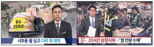 채널A는 <시위용 쌀 싣고 다리 위 대치>에서 문제가 된 쌀과 나락 3,000여 톤을 ‘시위용’으로 규정했다. 나락이 ‘미신고 집회 용품’이라는 경찰과 “벼는 시위의 물품이 될 수 없다”는 전농 측의 주장이 대립한 사건을 두고 경찰 측의 주장을 일방적으로 보도한 것이다. 또 보도 시작부터 앵커는 “지난 10여 년 간 쌀값이 떨어질 때 정부가 세금으로 메워준 돈 11조원이 훌쩍 넘는다는 사실 알고 계신가요?”라고 말했다. 국민의 세금이 농민들에게 낭비되고 있다는 정부 측 주장을 슬쩍 멘트에 넣은 것이지만, 이에 대한 정확한 근거제시조차 하지 않았다. 채널A는 경찰과 대치하고 있는 농민들의 모습을 쭉 보여준 뒤, “농민과 경찰의 대치가 이어지면서 오늘 아침 출근길이 극심한 정체를 빚었습니다”라고 말했다. 일방적으로 한남대교 2차선을 봉쇄한 것은 경찰이다. 전농 측이 신고한 집회는 서울 광화문청사에서 열릴 예정이었고, 도로를 봉쇄한 경찰 탓에 어쩔 수 없이 도로에서 대치하게 된 것이다. 그럼에도 채널A는 경찰의 불법 도로 봉쇄로 인한 시민들의 피해조차 농민들에게 전가한 것이다.