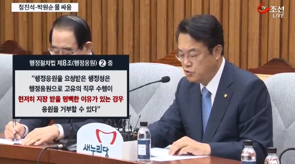 한편 TV조선의 다른 2건의 보도 중 1건은 박원순 서울시장에 공세를 펴는 내용이었다. 박원순 서울시장은 지난 5일 경찰이 소방용수인 소화전을 시위진압에 과도하게 사용하고 있다며 공급 불허를 선언했다. TV조선은 당일에도 <“살수차 물 끊겠다” 경찰 난감>(10/5, 19번째, 조정린 기자, https://bit.ly/2dwQamr)에서 “경찰은 과격, 불법 시위진압에 어려움을 겪을 수도” 있다며 경찰을 걱정하는 데 여념이 없었다. TV조선은 7일에도 <“서울시 사유화”…물대포 논란 가열>(10/7)에서 새누리당의 입장을 이용해 교묘히 박 시장을 몰아붙였다. 오현주 앵커는 “박원순 서울시장이 경찰 살수차에 소방 용수를 공급하지 않겠다고 하자, 새누리당 정진석 원내대표가 ‘박 시장이 서울시를 사유화한다’고 비판했습니다. 그럼에도 서울시는 물을 공급하지 않겠다고 못박았습니다”라며 보도를 시작했다. 앵커의 말에 이미 서울시가 억지를 부린다는 전제가 드러나 있다. 리포트는 박 시장을 비판한 정진석 새누리당 원내대표의 발언을 보여준 뒤, “새누리당이 시위진압용 살수차, 물대포에 소방용수를 공급하지 않겠다는 박원순 서울시장의 말은 '‘직무수행에 큰 지장이 없는 한 행정응원 요청을 거부할 수 없다’는 행정절차법을 위반했다고 비판”했다고 다시 자세히 입장을 풀어줬다. “대권 운운하기 전에 법 공부부터 하라”, “물공급 중단 발언은 공권력 무력화”라는 공세적 발언들도 덧붙였다. 이게 끝이 아니다. 화면은 “시정 운영과 국가 운영의 양식이 있는 사람이라면 어떻게 이런 이야기를 할 수 있습니까. 기가 찬 일이 아닐 수가 없습니다”라는 박명재 새누리당 사무총장의 발언 모습까지 보여줬다.