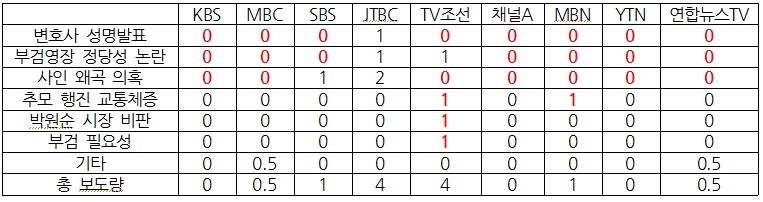 이는 연합뉴스TV도 마찬가지로서 “부검을 전제로 한 경찰의 협의 요구에 응할 뜻이 없다고 다시 한번 밝혔”다는 단신 1건을 내는데 그쳤다. 그나마 SBS가 9일, 건강보험급여를 신청할 때만 ‘외인사’를 인정한 서울대병원 행태를 1건 보도하면서 타사와 결을 달리했다.