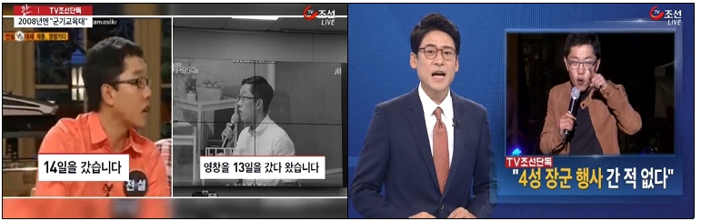 이어지는 TV조선 <단독/“4성 장군 행사 간 적 없다”>(10/7)는 “김씨와 함께 50사단 문화선전대에서 함께 근무했던 군 동료를 취재”한 내용이다. “김씨 발언의 진위를 확인하기 위해 TV조선”이 단독으로 보도했다고 한다. 보도는 “김제동씨가 50사단 문화선전대 방위병으로 복무한 18개월 동안 줄곧 부대 상관으로 함께 일한 A씨”를 익명 인터뷰하여 “제 기억으로는 별 4개 행사를 가본 적이 없어요. 문선대 행사를 갔다고 하면 반드시 제가 데려갔을 텐데”라는 발언을 집중 보도했다. “김 씨가 얘기한 2군 사령관이나 4성 장군 모임”이 거짓말이라는 것이 TV조선 보도의 요지이다.