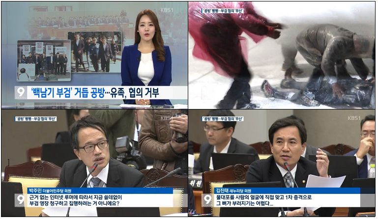 KBS <‘백남기 부검’ 거듭 공방…유족, 협의 거부>는 부검영장을 두고 벌어진 여야 의원들의 공방을 한 마디씩 보여준 후 곧바로 ‘빨간우의 공방’을 다뤘다. 기자는 “고 백남기 씨가 살수차의 물포를 맞을 당시의 화면도 쟁점이 됐”다면서 “당시 쓰러진 백 씨에게 달려갔던 빨간 우의 차림의 남성이 백 씨에게 충격을 가했을 수 있다는 내용이 부검 영장에 적시됐기 때문”이라는 설명했다. 화면에는 백 농민이 물대포를 맞을 당시 영상이 나왔고 “근거 없는 인터넷 루머에 따라서 지금 쓸데없이 부검 영장 청구하고 집행하려는 거 아니에요?”라는 박주민 더민주 의원의 발언과 “물 대포를 사람의 얼굴에 직접 맞고 1차 충격으로 그 뼈가 부러지기는 어렵다”는 김진태 새누리당 의원의 발언 장면이 이어졌다. 마지막 장면은 “사망의 과학적이고 객관적인 원인을 규명하기 위해서는 부검이 불가피하다”는 김수남 검찰총장 발언이었고 기자는 “경찰은 오늘(13일) 서울대 병원을 찾아 협상 대표를 정해 달라고 요구했지만 유족 측은 부검을 전제로 한 협의 절차를 거부”다는 말로 보도를 마무리했다.