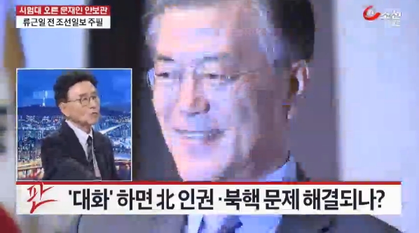 먼저 이상목 앵커가 “문 전 대표가 남북대화가 단절됐기 때문에 핵과 인권 문제가 심각해졌다고 했다. 어떤 내용인가”라고 묻자 류 주필은 “남북대화가 단절된 것이 우리 때문인가. 아니다”라면서 “우리는 박정희부터 오늘까지 약 40년간 남북 적십자 회담하자, 남북정상회담하자, 불가침 조약하자, 공존교류화해협력하자, 단계적 통일하자, 오로지 대화에 의한 통일만 추구하자, 시종일관 그래서 일부에서는 너무 비겁하지 않느냐, 남북대화를 위해 을처럼 매달리지 않았느냐는 비난도 샀다”고 목소리를 높였다. 이어서 “그러나 그동안 북한은 우리 모르게 핵개발하고 어느 날 갑자기 맘에 안 드니까 서울 불바다, 백악관 잿더미라고 한다”며 대화 단절의 원인은 북한에 있음을 강조했다. 류 주필의 결론은 “대통령이 거기에 안 된다, 우리도 비핵화를 하면 (대화)하겠다는 것을 강경정책이라고 나무라니 어쩌면 좋냐”는 문 전 대표 비판이다. 류 주필은 “박정희부터 오늘까지 약 40년간” 우리 정부가 적십자 회담 및 정상회담 등 대화 노력을 했다고 뭉뚱그렸지만 그 모든 대화 노력이 멈춘 것이 바로 이명박, 박근혜 정부로 이어지는 보수정권 시기였다. 류 주필은 이런 사실은 얼버무린 채 무작정 북한의 일상적 수사인 ‘서울 불바다’를 빌미로 전쟁을 의미하는 박근혜 정부의 ‘선제타격론’을 옹호했고, 문재인 전 대표는 비난했다. 근거도 없는 흑백논리이다.
