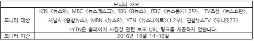 한편 국가폭력에 희생된 백남기 농민에 대한 무관심도 이어지고 있다. 14~16일 3일간 백 농민의 사인 왜곡 의혹을 다룬 방송사는 이번에도 JTBC뿐이고, 다른 방송사들은 국회에서 나온 ‘묵념 파행’만 짧게 언급했을 뿐이다.
