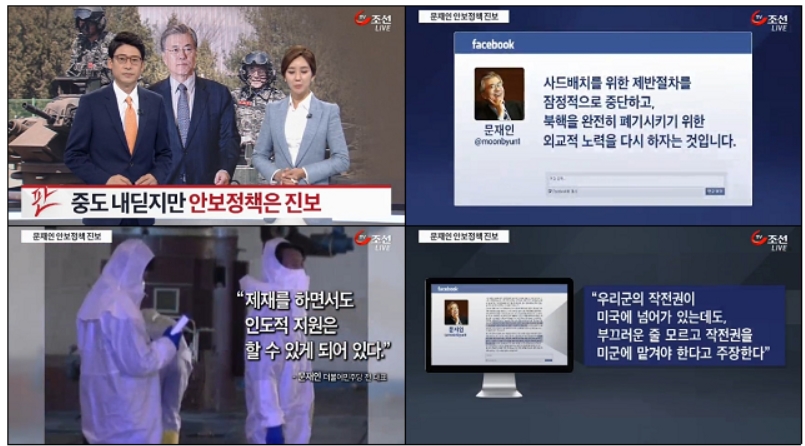 먼저 TV조선은 2건의 보도에서 대화‧협력을 우선시하는 문 전 대표의 안보관을 비난했다. TV조선 <중도 내딛지만 안보정잭은 진보>(10/14)은 “문재인 전 대표는 최근 재벌의 역할을 인정하고, 경제성장을 강조하며 중도 색채를 강화”했지만 “안보 문제에선 좌향좌 기조가 여전”하다고 못 박았다. 그 이유로 제시한 것은 ▲“사드에 대해 ‘정부가 위기조장으로 국민을 분열시킨다’며 재검토를 주장”하고 있다 ▲“북한의 핵미사일 도발에도 대북 지원을 주장”하고 있다 ▲“전시작전권과 관련해선 ‘우리군의 작전권이 미군에 넘어가 있는데도, 부끄러운 줄 모르고 작전권을 미군에 맡겨야 한다고 주장한다’며 박근혜 정부를 비판”하고 있다는 것이다.