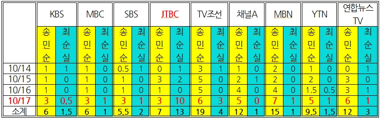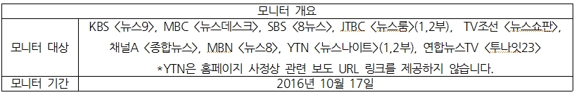17일에는 KBS 0.5건, MBC, SBS, MBN, YTN, 연합뉴스TV가 1건씩 ‘최순실 게이트’ 관련 보도 냈다. 그러나 이들 보도는 최순실 씨의 딸에 대해 특혜가 없었다는 이화여자대학교 측의 해명과 학생들의 반발을 전한 보도에 불과했다. ‘의혹 보도’가 아니라는 의미이다. 방송사들은 ‘송민순 회고록’ 논란에 더 많은 보도를 쏟아냈고 특히 TV조선, 채널A, MBN, YTN, 연합뉴스TV는 5건 이상을 보도하면서 새누리당의 프레임을 그대로 좇았다.