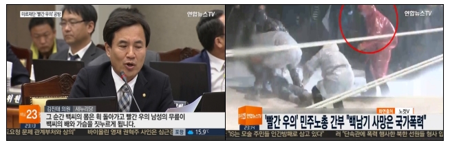 <'빨간 우의' 민주노총 간부 "백남기 사망은 국가폭력">(10/19, 12번째, 단신, https://bit.ly/2elJHyx)에서 연합뉴스TV는 빨간 우의로 알려진 민주노총 간부의 인터뷰를 보도한다. 연합뉴스TV는 “백 씨 사건은 국가폭력 살인사건” ‘빨간 우의’ 남성의 주장을 보도하고 “당시 경찰의 물대포 직사가 계속돼 백 씨를 안전한 장소로 옮기러 달려간 것”이라며 “물대포가 강해 넘어졌고, 주변 분과 함께 백 씨를 길가로 옮겼다”는 증언 또한 첨부한다. 13일 김진태 새누리당 의원의 “그 순간 백 씨의 몸은 휙 돌아가고 빨간 우의 남성의 무릎이 백 씨의 배와 가슴을 짓누르게 됩니다”라는 발언을 인용해 빨간 우의 가격설을 보도했던 것과는 달리 19일에는 반대 측 입장을 보도한 것이다. 짧은 단신이지만 19일 빨간 우의 민주노총 간부의 언론 인터뷰를 무보도한 다른 방송사와는 달리 의미 있는 보도라고 할 수 있다. 하지만 18일 있었던 <민중의 소리>의 상황속보 특종을 보도하지 않은 점은 아쉬움으로 남는다.