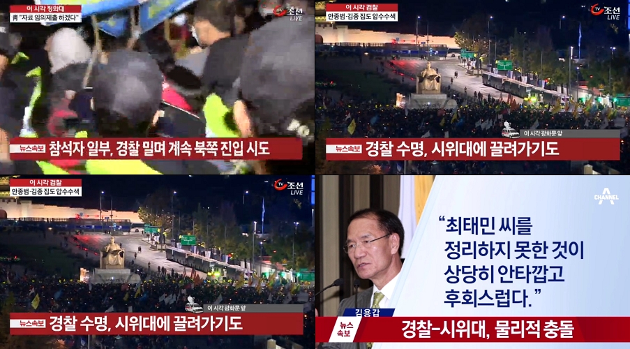 채널A <촛불 시위대, 광화문으로 행진>(https://bit.ly/2dV9rka)도 “일부 참가자가 종로 1가에서 청와대쪽으로 방향을 바꾸면서 이를 저지하는 경찰과 몸싸움”이라는 설명과 “경찰-시위대 물리적 충돌”이라는 자막을 계속 내보내는 식입니다. 심지어 TV조선은 집회 생중계를 하다말고 ‘안종범‧김종 압수수색’을 보도하기도 했는데 이 순간에도 화면은 집회 장면이었고 자막은 ‘경찰 수명, 시위대에 끌려가기도’였습니다. 채널A도 마찬가지여서 보도 내용과 화면은 청와대 수석비서관 일괄 사퇴인데 자막은 “경찰-시위대 물리적 충돌” 등 ‘폭력 시위’를 부각한 것들이었습니다.