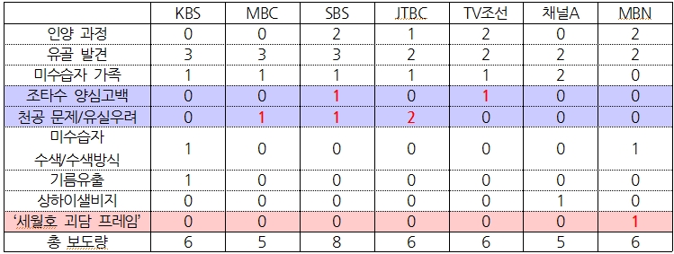 SBS와 MBC도 유실 우려에 대해 각각 한 건을 보도했습니다. TV조선과 채널A는 유실 우려를 따로 다루지 않았고 다만 미수습자 가족들의 반응을 1~2건 전하면서 유실 우려 입장을 전달하기만 했습니다.