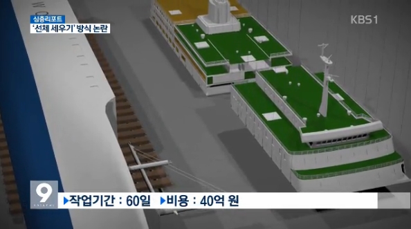 KBS는 먼저 선체를 세우는 방식에 “미수습자가 있을 걸로 추정되는 객실 등 3개 층만 떼어 직립”하는 객실 직립 방식과 “선체를 통째로 일으켜 세”우는 육상 직립 방식이 있다며 비교했습니다. 이어서 객실 직립 방식이 “선체 훼손 논란을 우려해 절단을 최소화하면서도 미수습자 가족들의 뜻대로 남은 희생자들에 대한 수색을 신속히 진행할 수 있”고 육상 직립 방식보다 “시간과 비용 측면에서 효율적”이라고 평가했습니다. 또 “절단을 통한 빠른 수습이냐, 선체 보존을 통한 진상 규명이냐, 두 가치가 충돌”한다고 했습니다.