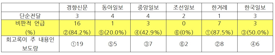 비판적 언급과 규탄수준의 언급을 합한 보도량을 합해보니 경향신문이 23건으로 가장 많았다. 이어 한겨레가 14건이었다. 각 언론사 내에서 내보낸 총 관련 보도수의 백분율로 따져보면 한겨레가 82.4%로 가장 높은 비율이고, 경향신문이 74.2%였다. 보도량이 거의 없는 조선일보를 제외한다면, 동아일보, 중앙일보와 한국일보의 순으로 가장 낮은 비중을 차지하고 있다.