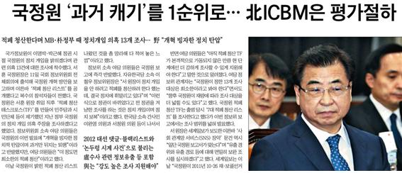 심지어 조선일보는 최근 세계일보가 보도한 국정원 SNS 장악 문건에 대해서도 별도 보도를 내놓지 않고 <국정원 과거 캐기를 1순위로… 북ICBM은 평가절하> 내에 짧게 언급하는 수준으로 넘어가고 있는데요. 조선일보가 요약한 세계일보의 보도 내용은 “‘국정원이 2011년 10·26 재·보궐선거 직후 2012년 총선·대선을 대비하기 위해 트위터와 페이스북을 장악해야 한다는 내용의 보고서를 작성해 이명박 정부 청와대에 보고했다’는 취지의 보도를 했다”가 전부입니다. 게다가 조선일보는 바로 이 뒤에 “이에 대해 이명박 정부 관계자는 본지 통화에서 ‘6년 전 일을 어떻게 일일이 기억하겠느냐’면서도 ‘정치 공작이며 보복’이라고 했다”는, 익명의 이명박 정부 인사의 부실하기 짝이 없는 변명을 그대로 실어주기도 했습니다.