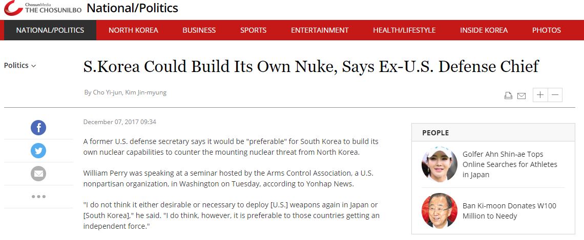 제보 확인 조선일보는 <페리 전 미 국방장관 “한국에 핵 재배치보다 자체 핵무장하는 게 낫다”>(12/7 조의준 특파원 https://bit.ly/2k9IqJS 현재 삭제됨)에서 윌리엄 페리 전 미국 국방부 장관이 “한국의 자체 핵무장을 선호한다”라고 말했다며 “미국의 전직 고위 외교․안보 관련 인사가 한국의 자체 핵무장 가능성을 언급한 것은 이례적인 일이다”라고 보도했습니다. 이어 조선일보는 페리 전 장관이 워싱턴 DC에서 열린 무기통제협회 주최 세미나에서 “한국 또는 일본에 핵무기를 배치하는 것은 바람직하지 않다”, “이 나라들이 독립적인 핵무기를 보유하는 것이 바람직하다고 생각한다”라는 발언을 했다고 연합뉴스를 인용하면서 보도했습니다.