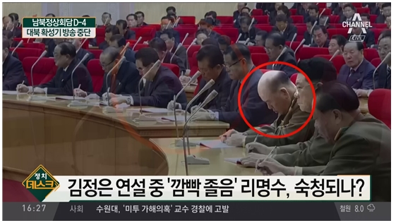 먼저 “풍계리 핵실험장 폐기” 등 북한의 선언 내용을 전한 이용환 앵커는 “그런데 노(은지) 기자, 그 영상 공개된 거 보니까 약간 아찔한 장면이 있었다는데 이게 무슨 얘기입니까? 보기엔 그 사람의 안위가 걱정될만한 그런 장면이었는데”라며 갑자기 화제를 전환했습니다. 채널A 노은지 기자는 화면과 함께 설명을 이어갔습니다. 화면에는 북한이 공개한 중앙위원회 전체회의 영상이 나왔고 채널A는 조는 듯 머리를 숙인 리명수 총참모장을 빨간 원으로 표시했습니다. 노 기자는 “그림 중에 빨간 동그라미를 보시면 지금 고개를 숙인 사람이 있는데요. 바로 북한 군부 서열 2위인 리명수 총참모장입니다. 다른 사람들이 이렇게 꼿꼿하게 앉아 있는 것과 달리 지금 보시면 힘없이 손이 내려가고 고개가 떨어지는 이런 모습 볼 수 있어요. 지금은 고개를 완전히 숙이고 눈을 감고 있는 걸 봤을 때 졸고 있다고 밖에 보이지가 않는데” “맨 앞줄에 앉아서 김정은이 얘기 할 때 아마 졸았던 걸로 추정이 돼요. 그러다 보니까 과연 이제 저 향후 거취가 어떻게 될 것이냐. 왜냐하면 조는 것들은, 김정은 앞에서 졸았을 때 불경죄로 간주가 되잖아요. 그래서 저 모습이 포착된 걸 보고 앞으로 향후 거취가 어떻게 될 것이냐, 이런 걱정 어린 시선들이 나오고 있습니다”라고 부연했습니다.
