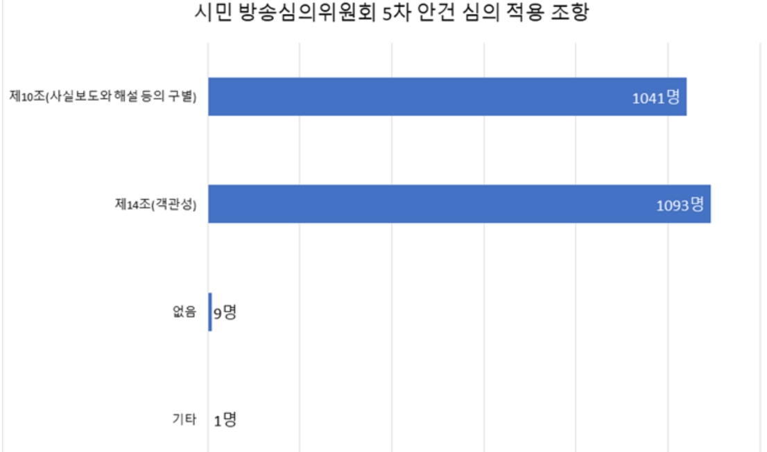 시민 방심위원회는 5차 안건에 적용할 수 있는 조항을 제10조(사실보도와 해설 등의 구별), 제14조(객관성)로 제안했다. ‘없음’과 ‘기타 적용 조항 의견’도 택할 수 있도록 명시했고, 시민들은 적용 조항을 중복 선택할 수 있다.